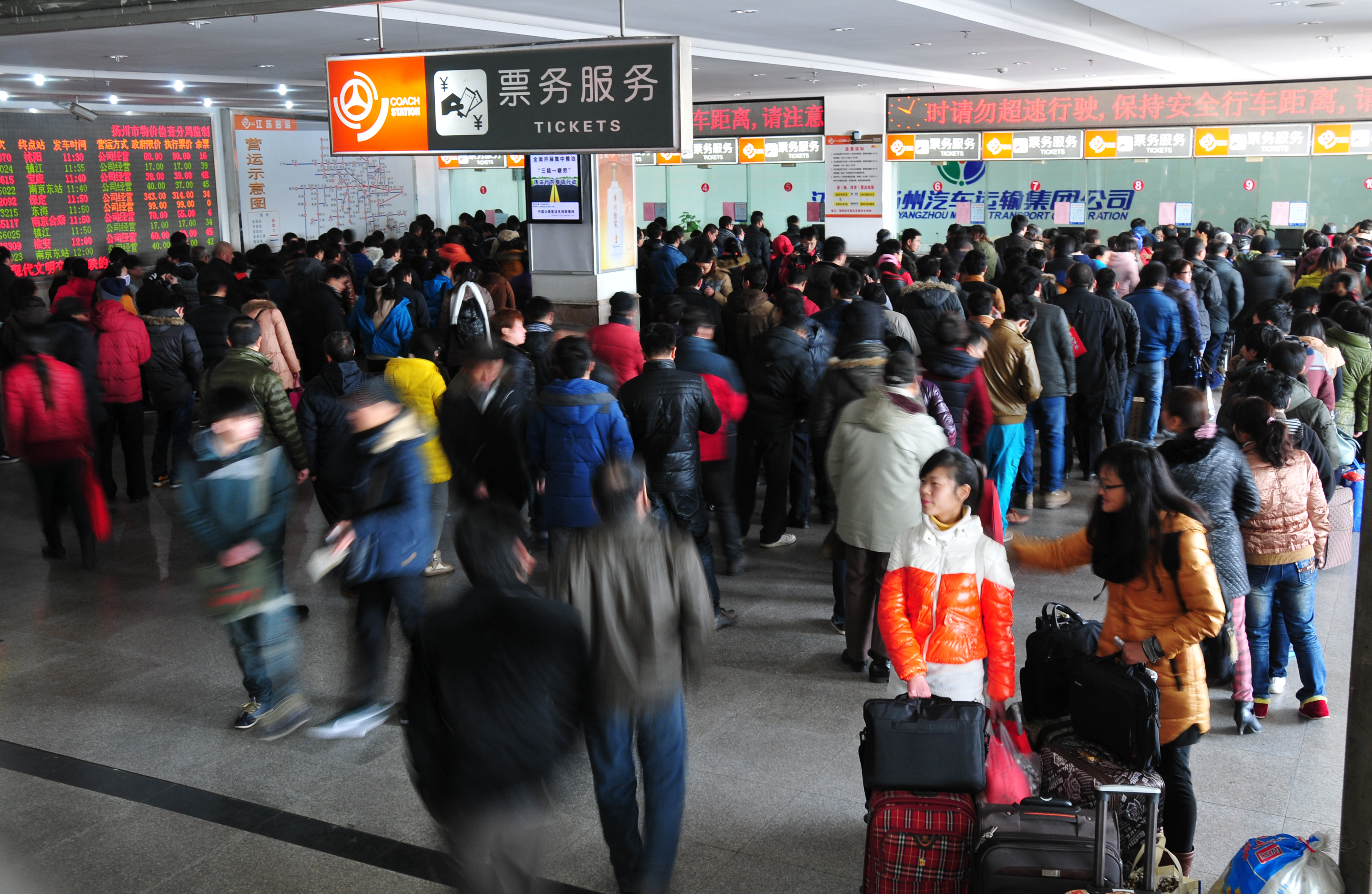 為應對旅客購票高峰壓力,揚州汽車站打開了10個售票窗口,汽車東站打開了7個售票窗口,另外還使用了自助售票機、配備了退票專窗、手機換取票專窗。為方便民工返鄉(xiāng),車站還主動聯系揚州晚報推出“民工返鄉(xiāng)直通車”,集中為市區(qū)周邊廠礦工地的民工兄弟團體預訂了近萬張汽車票。