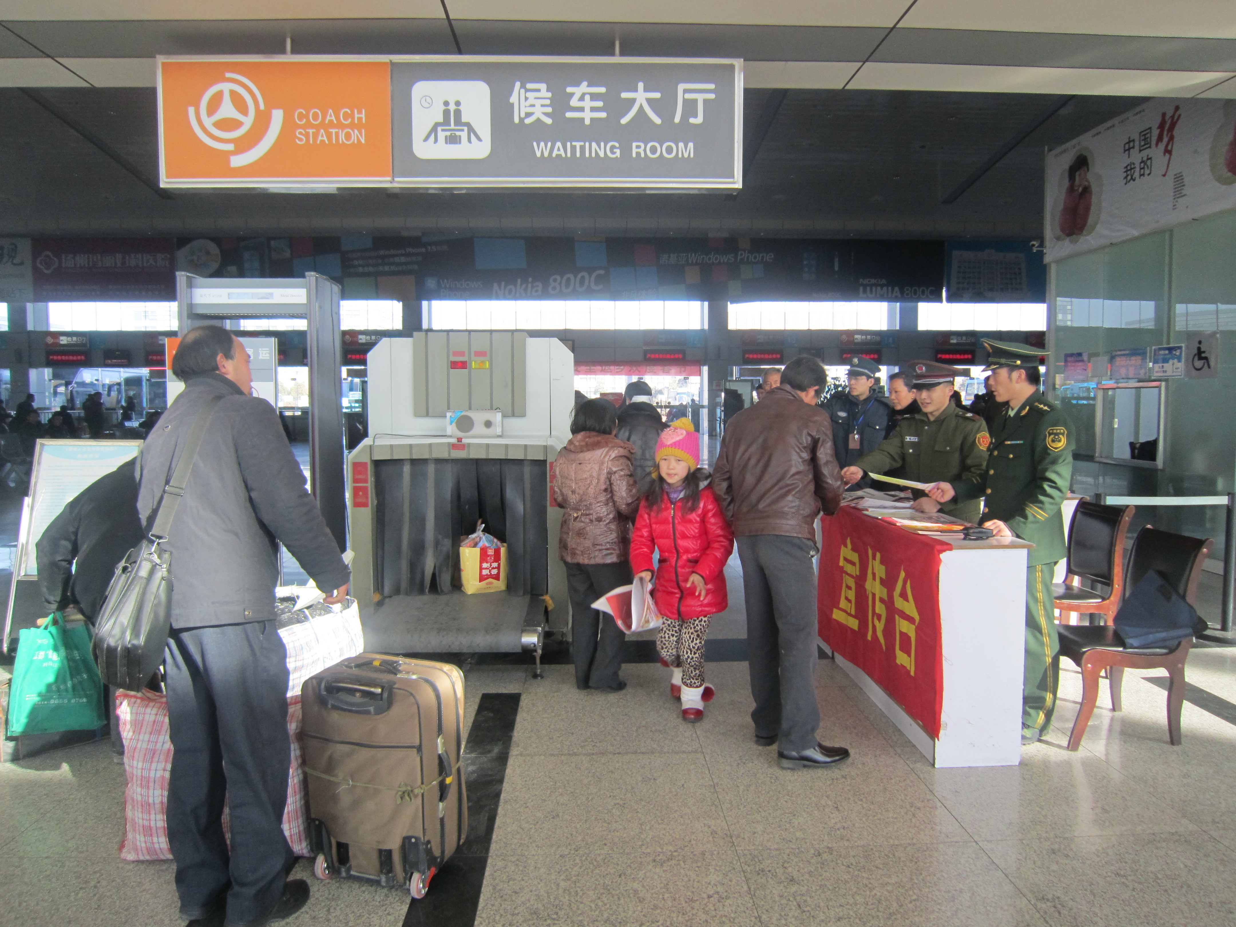 危險品檢查儀旁,紅色的安全宣傳臺引人注目,武警揚州消防支隊的幾名官兵和車站員工一起向接受危險品檢查的旅客熱情發放宣傳畫,并提醒在返鄉旅程中應該注意的安全事項。幾名女官兵還走進候車廳發放,講解遇有緊急情況時的急救逃生知識。不少旅客在候車過程中,認真看著宣傳畫,還不時交流,一旁的官兵不時接受旅客的咨詢,解答他們的問詢。