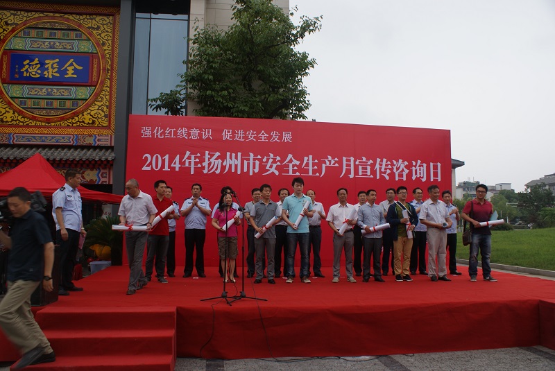 6月16日上午,揚州市安委辦會同蜀崗—瘦西湖風景名勝區管委會在虹橋坊舉行了以“強化紅線意識,促進安全發展”為主題的2014年揚州市“安全生產月”宣傳咨詢日活動。市安委會、市安監局、蜀岡—瘦西湖風景名勝區管委會、市人保公司負責人出席了活動。市安監局、揚汽集團、市城建控股集團、市工藝美術集團、金茂化工集團、揚子江集團、建工控股集團等11家單位以及消防、建筑、燃氣、氣象、質監、部分駐揚單位的職工代表共計400余人參加了活動。
