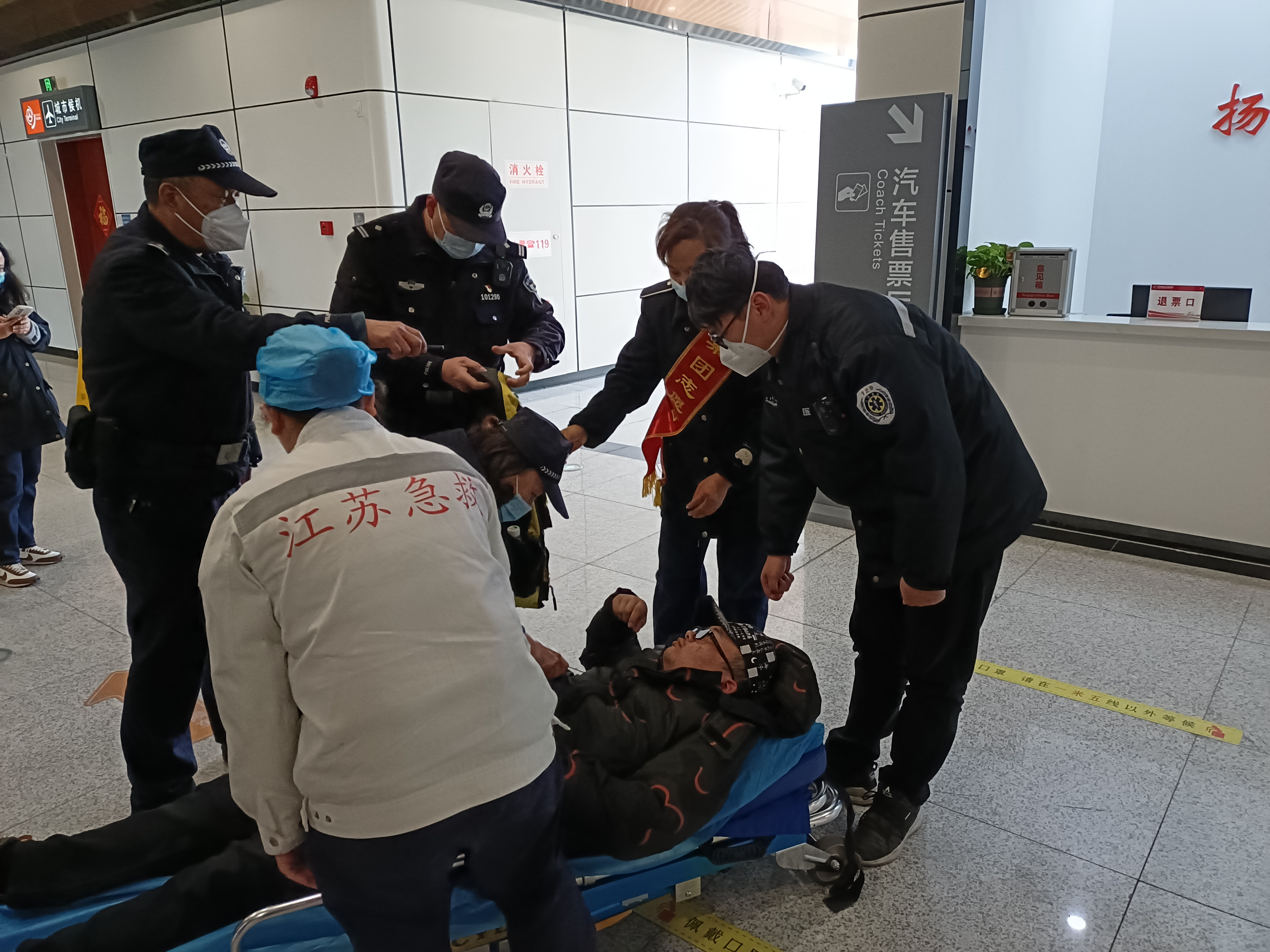 2月16日下午,揚(yáng)州東樞紐汽車站售票處,一名正在購(gòu)票的旅客突發(fā)癲癇,暈倒在地,現(xiàn)場(chǎng)工作人員及志愿者立即進(jìn)行了救助。